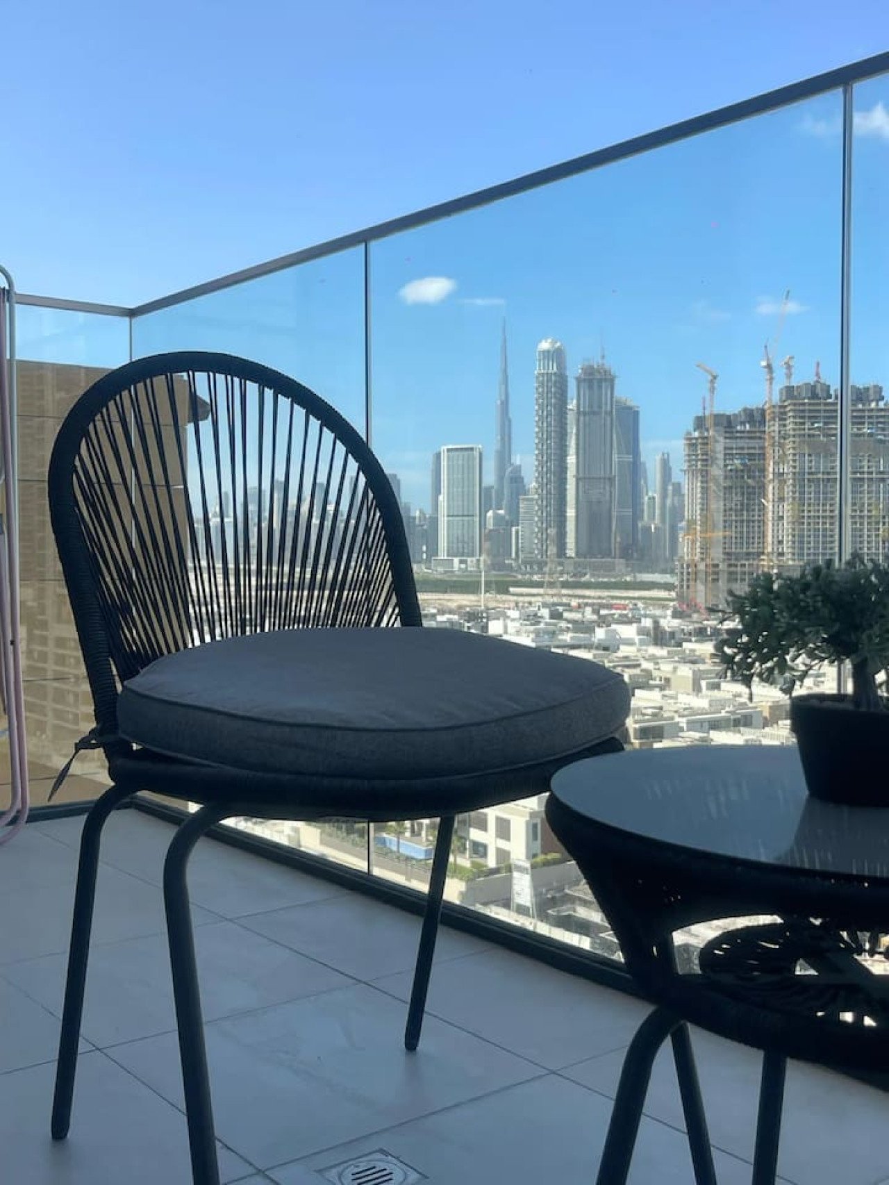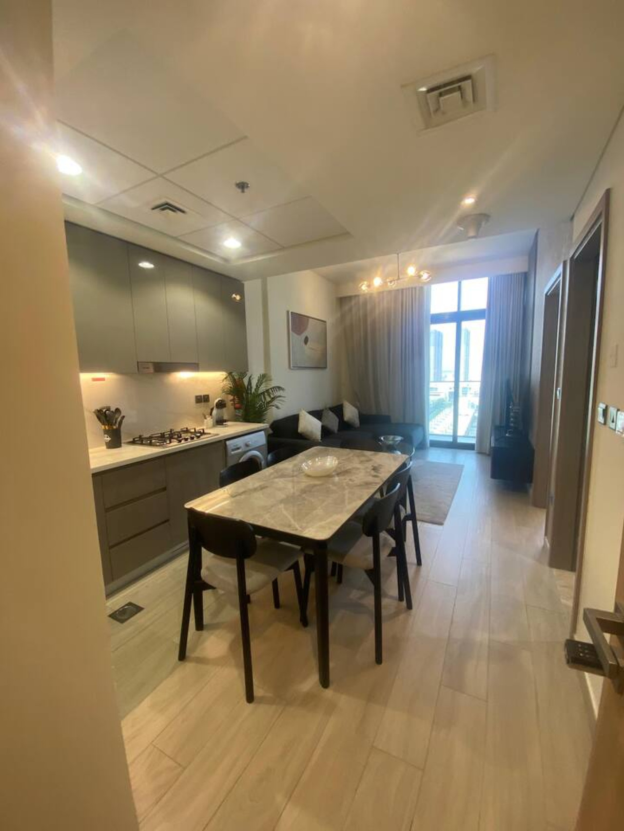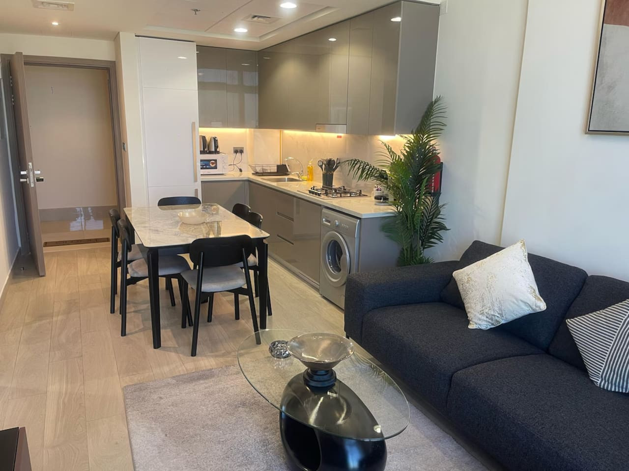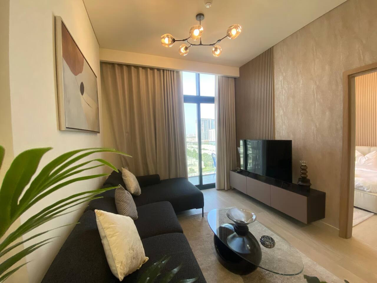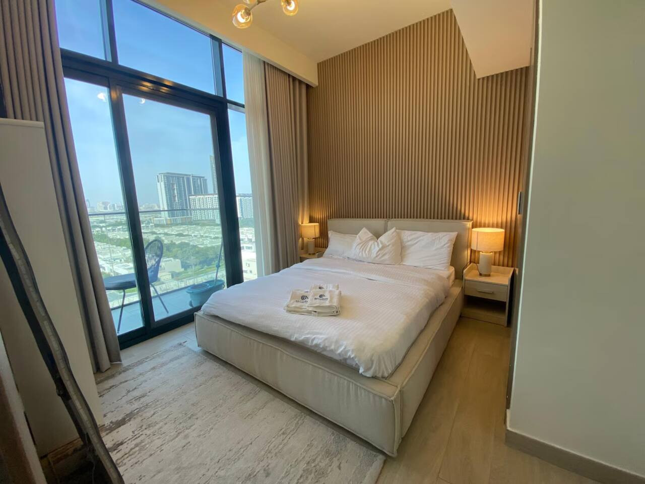 Our fully furnished unit features an open-concept layout with high ceilings and sleek modern design finishes. The living space includes a plush queen-sized bed, spacious wardrobes, a comfortable sofa, a Tv, and a fully equipped kitchen with high-quality appliances. It also features a private balcony that opens to breathtaking views of the city skyline.
