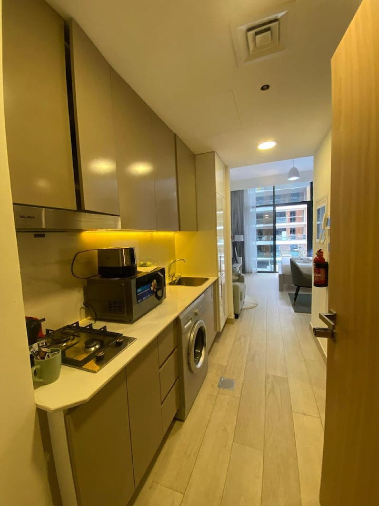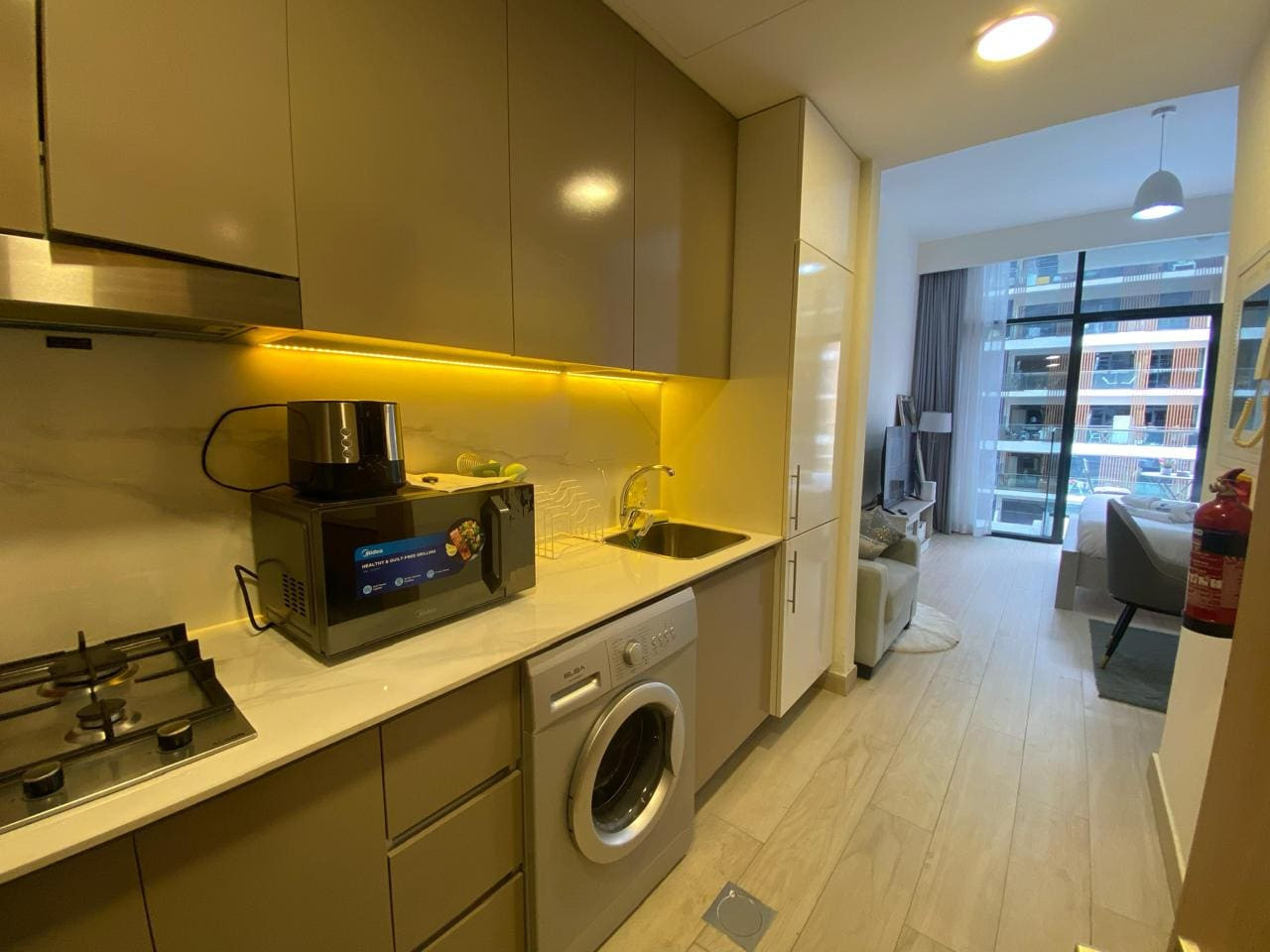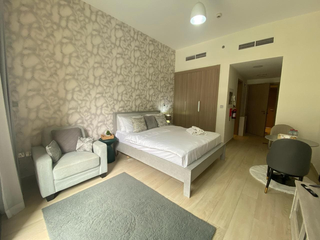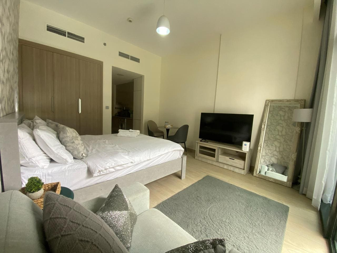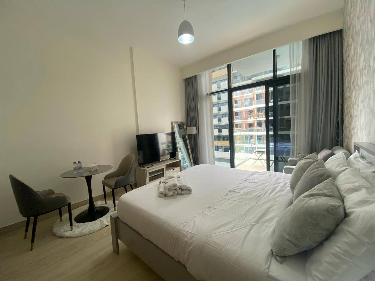 Enjoy a stylish and comfortable stay in this modern studio with a private balcony offering stunning city views. Perfect for solo travelers, couples, or business stays, this fully furnished space features a plush king-size bed, Wi-Fi, Smart Tv, and a cozy dining area. The kitchenette is fully equipped for your convenience.