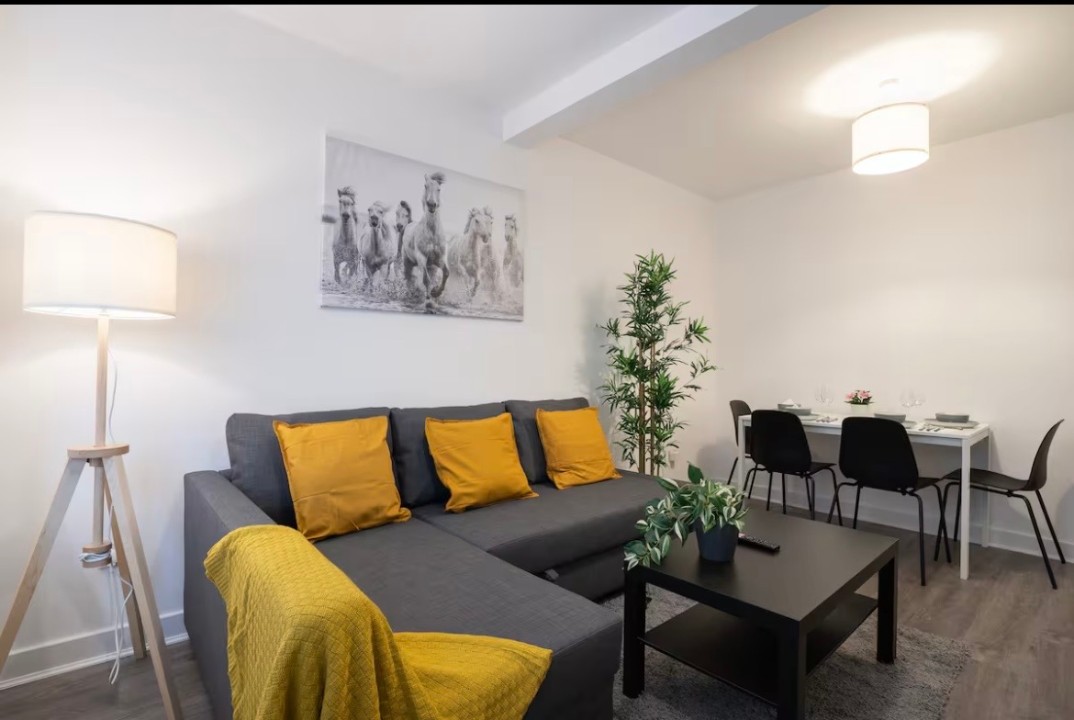 The bathroom offers both a shower and a bathtub, making it easy to enjoy a quick refresh or a relaxing soak after a long day of exploring. Thoughtful touches throughout the apartment—comfortable seating, bright living spaces, and practical amenities—ensure a convenient and welcoming stay for every guest.