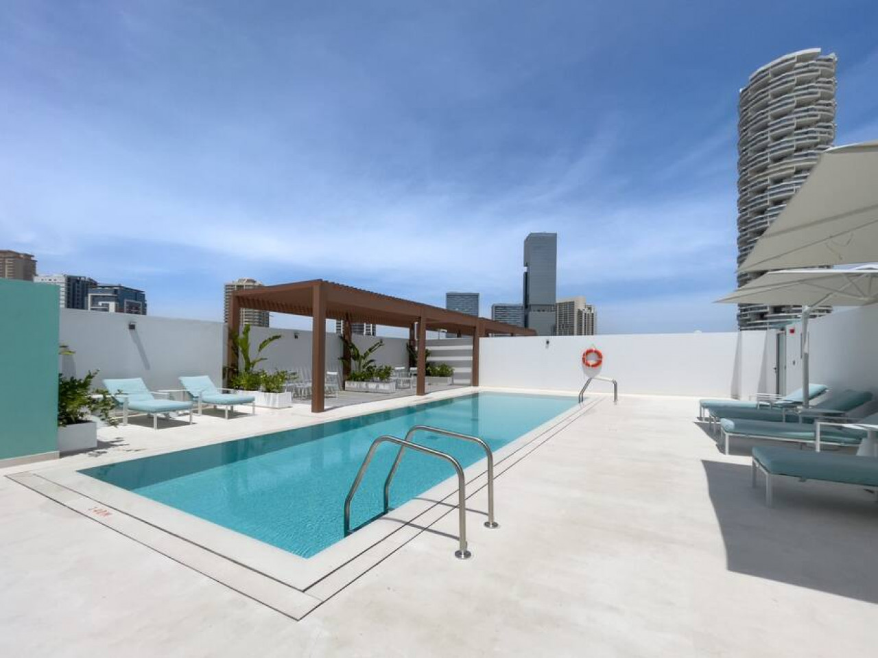 Only the residents of the building have free access to the tower gym and outdoor swimming pool surrounded by sun beds.