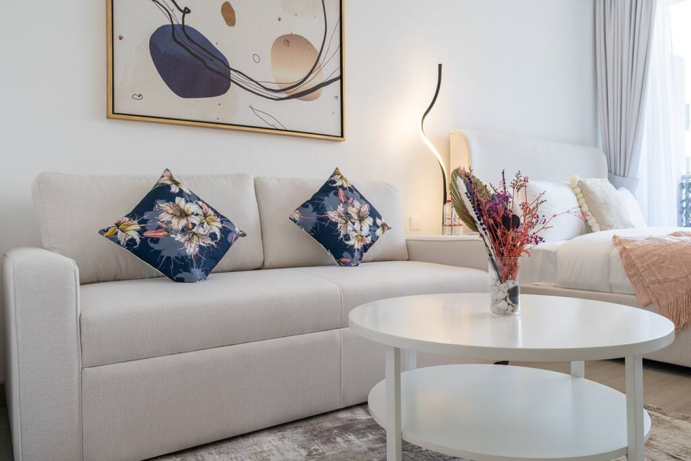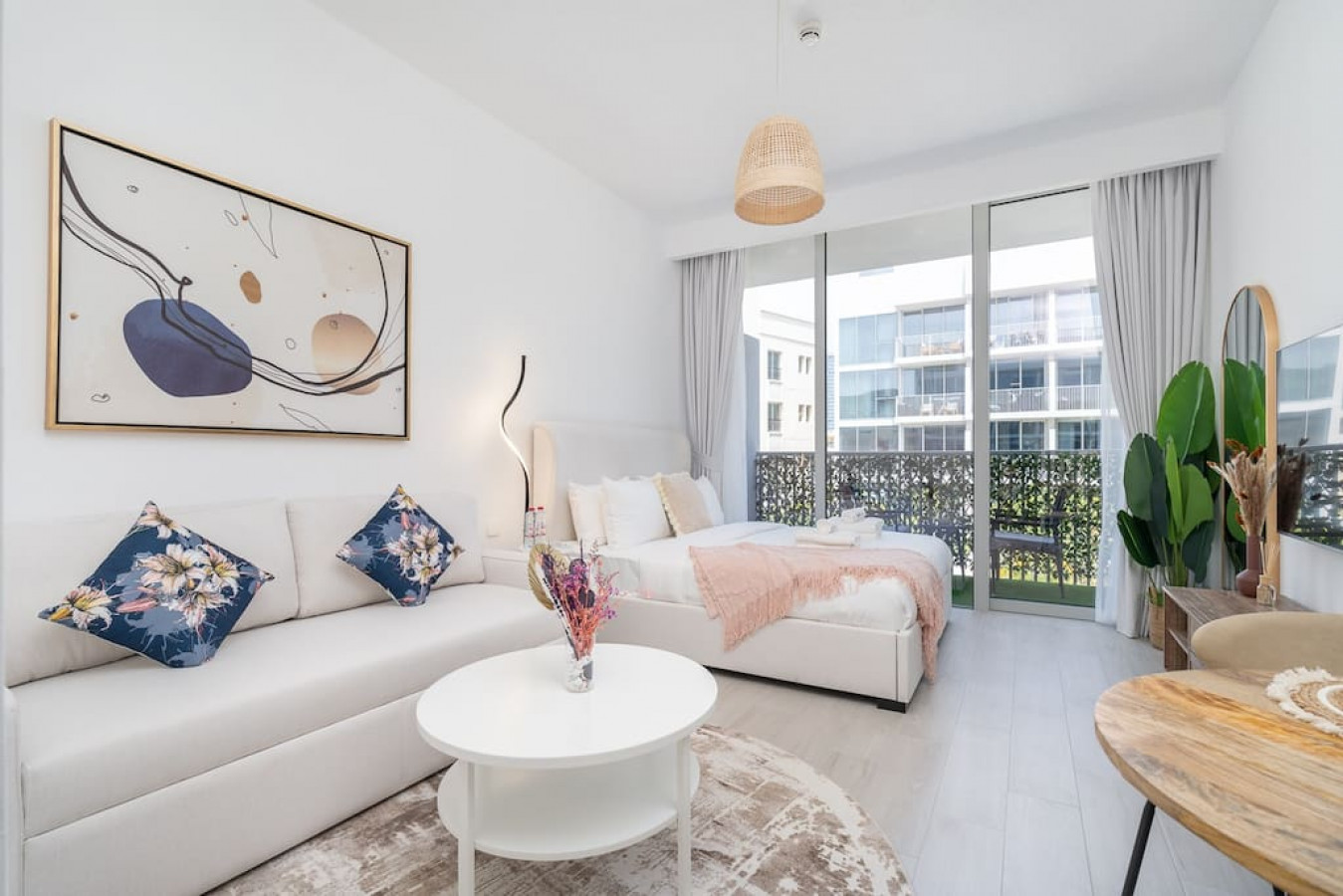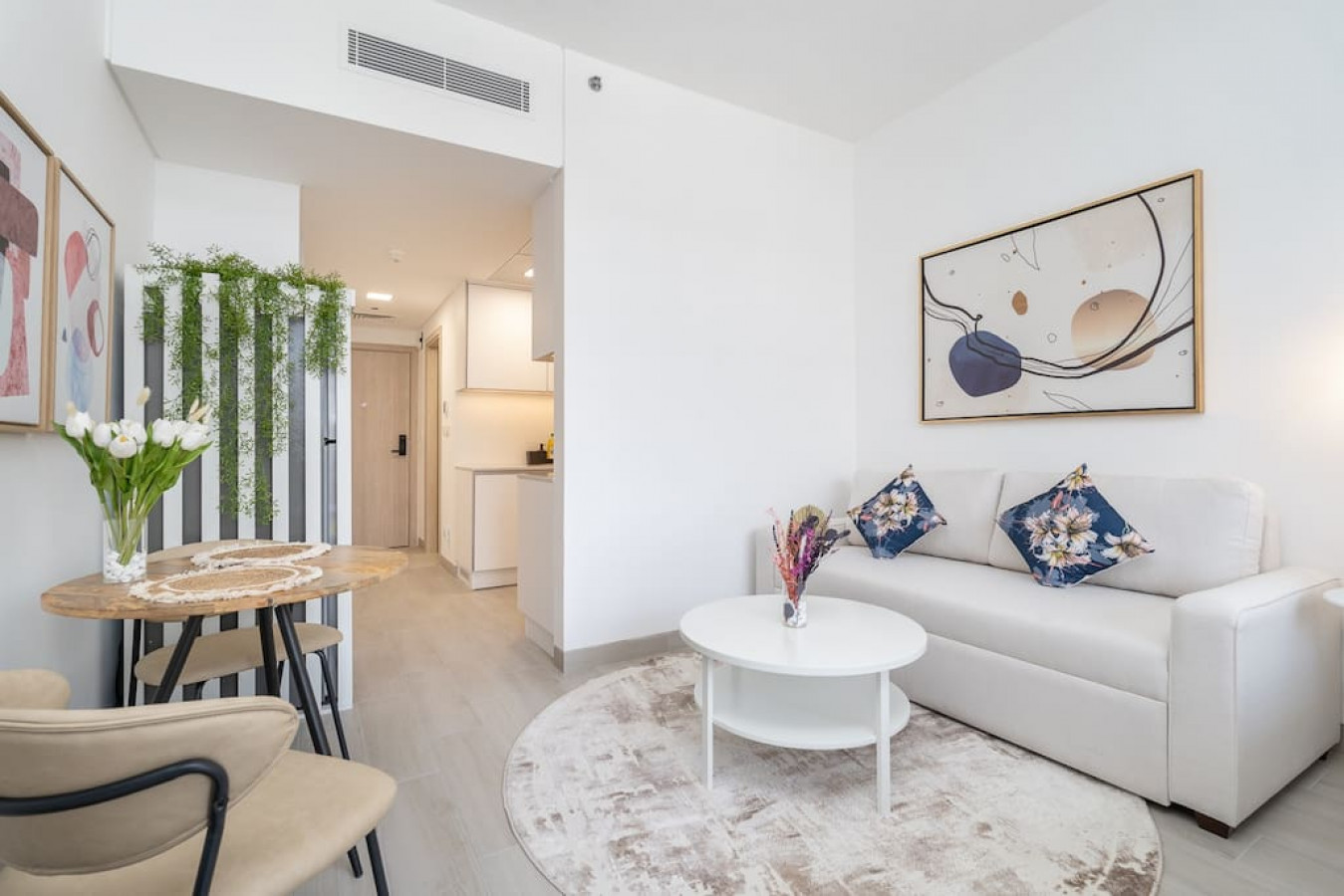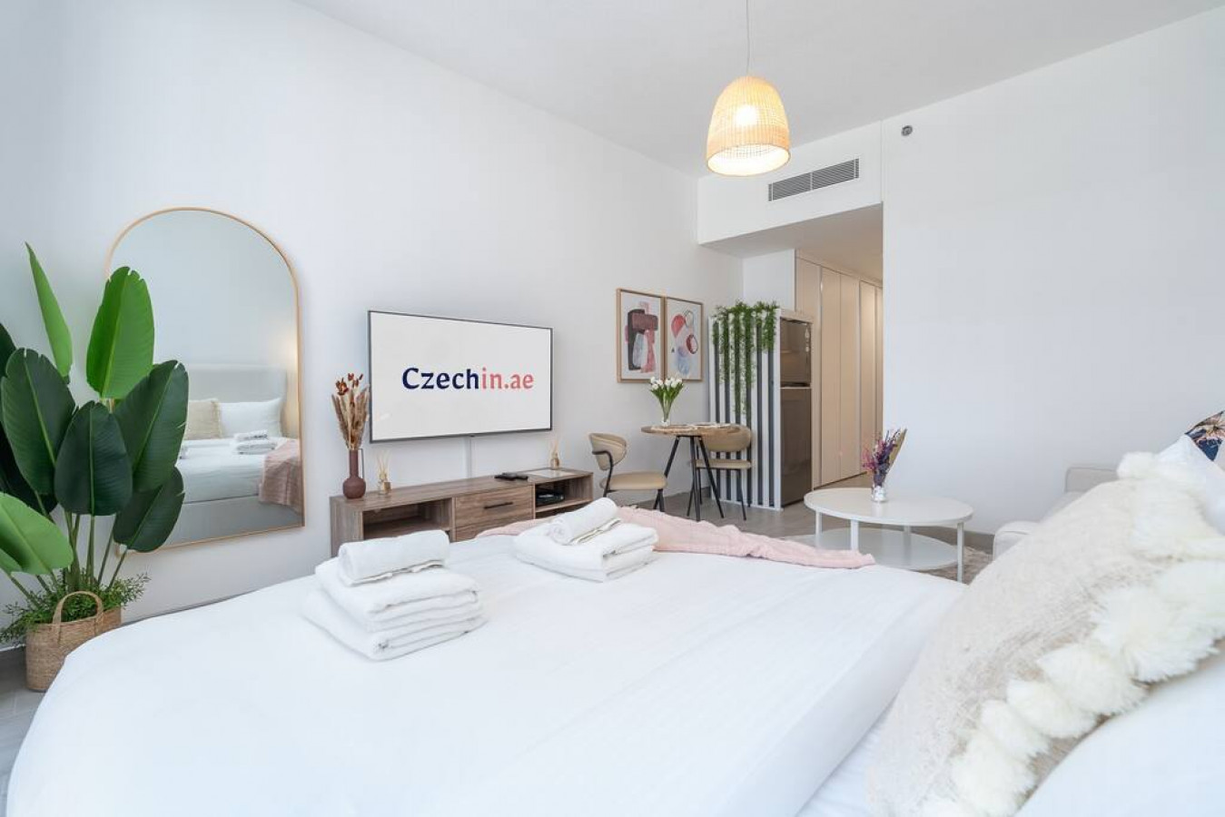 Brand new studio apartment with most comfortable queen size bed, located in Jumeirah Village Circle with a balcony in Luma 21.