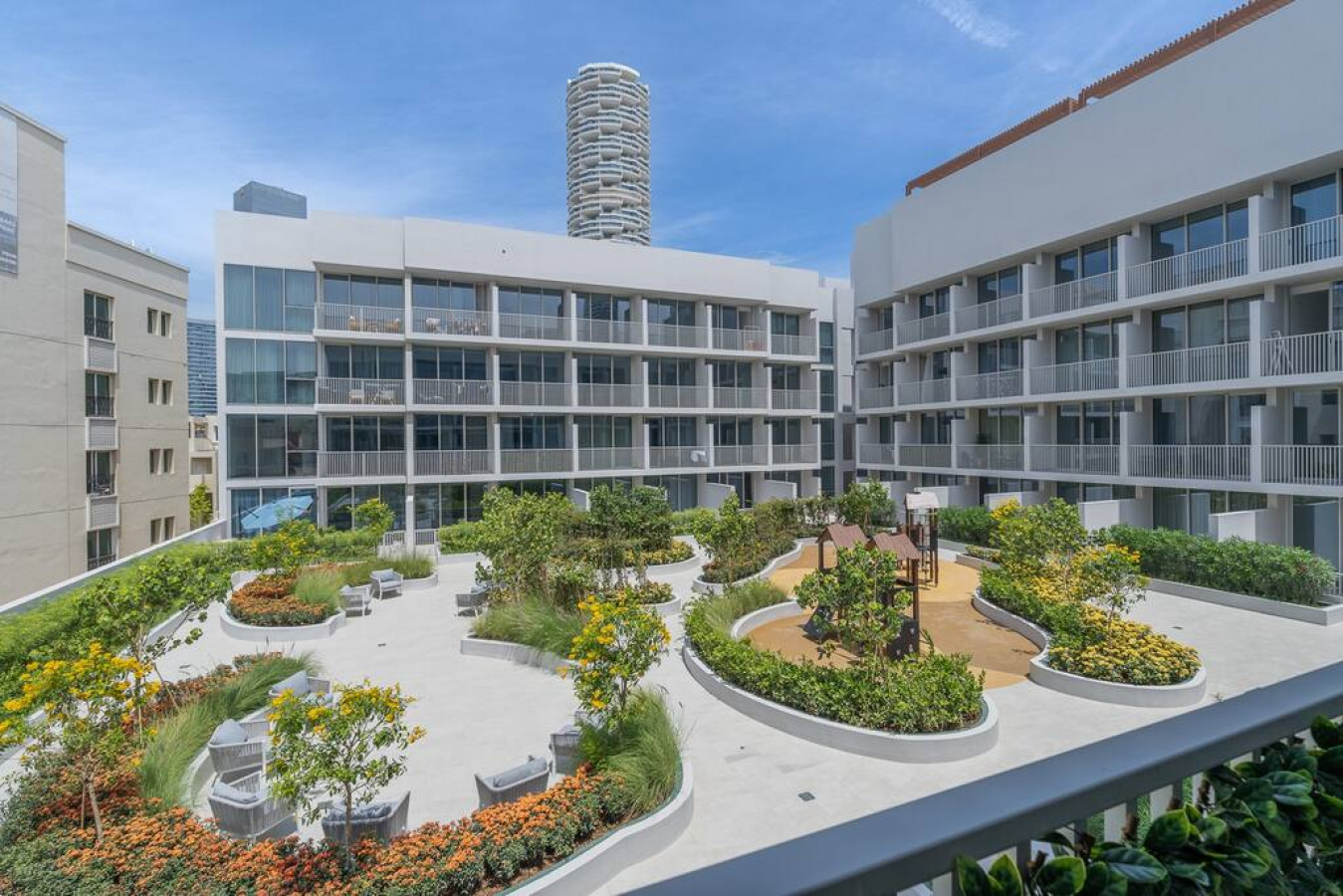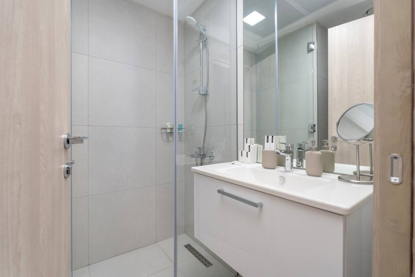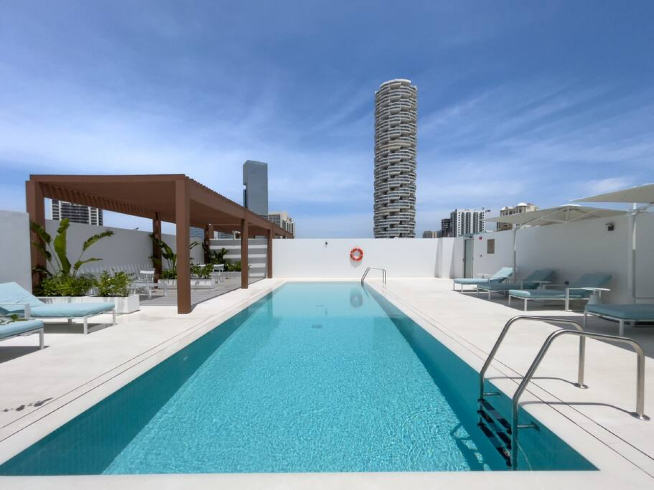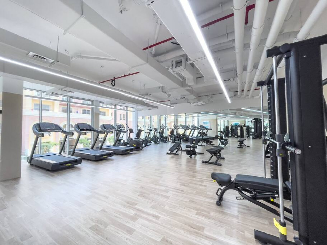 Only the residents of the building have free access to the tower gym and outdoor swimming pool surrounded by sun beds.